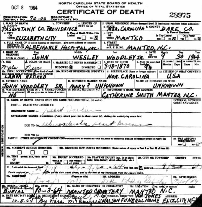 ![]() According to a death certificate, John Wesley Woodley, Jr. was born to John Wesley & Mary Woodley, Sr. on March 18, 1870 and died on Sept. 30, 1964. He married Amelia A. Toler (1880-1949) in Manteo on Sept. 23, 1900. This picture is believed to have been taken between 1948-1951 in front of Hotel Fort Raleigh in Manteo. John had hogs to feed and he went around with his cart and collected table scraps that people had saved for him. Sometimes he would let the children ride with him and they loved it. |