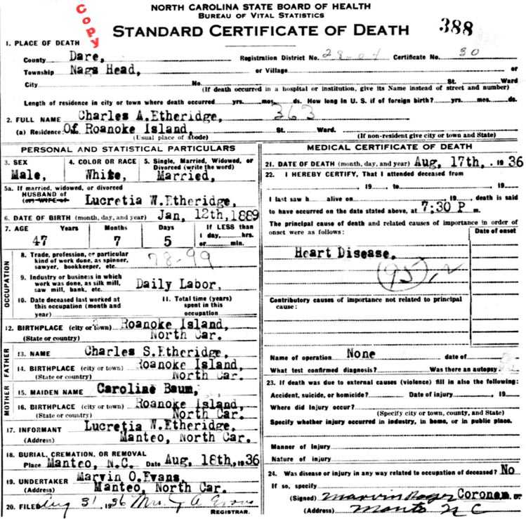 C.S. MeekinsNOTE: Charles Alexander Etheridge, only child of Charles Skinner Etheridge and Caroline Baum, was born in Manteo on Jan. 12, 1888 and died Aug. 17, 1936. He married Lucretia Williams (1888-1966) in Manteo on January 26, 1926. They had no children.