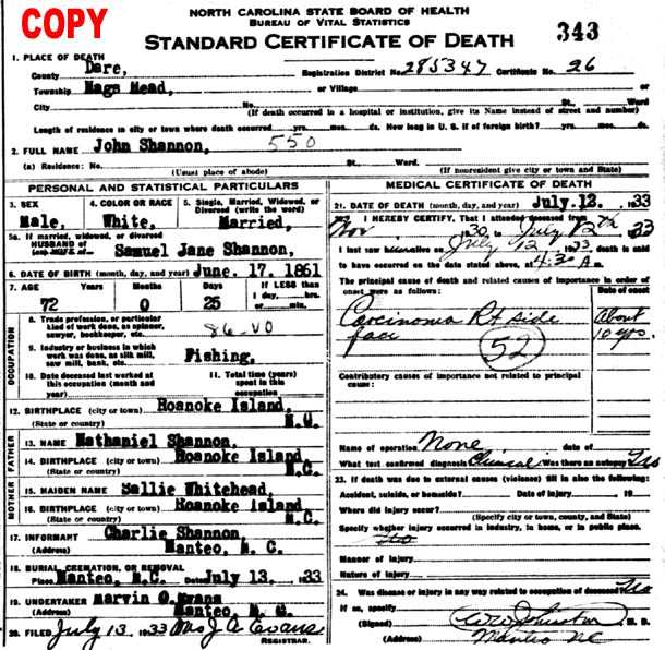 C.S. Meekins, Clerk Superior CourtNOTE: John F. Shannon, Sr., son of Nathaniel A. Shannon and Sarah Margaret Williams [death certificate below states maiden name was Whitehead], was born in Manteo on June 17, 1861 and died July 12, 1933. John married Samuel Jane "Sammy" Baum on Sept. 15, 1891 and to them were born the following children: