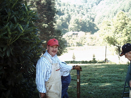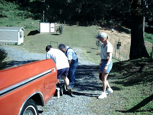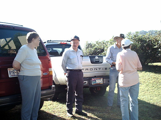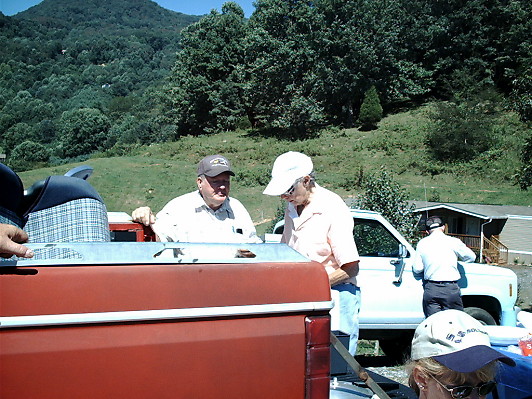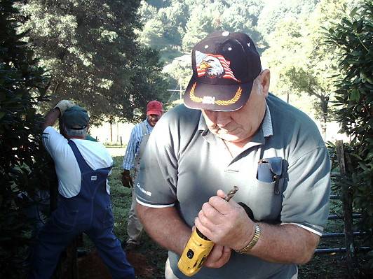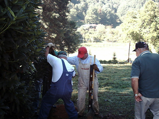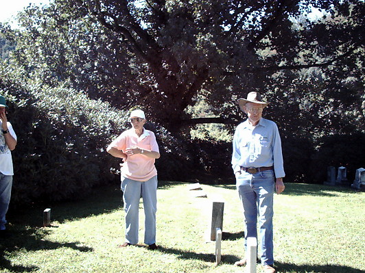 To our pleasant surprise, we found that both parts of the cemetery, and the roadside leading to it, were already neatly mowed and trimmed. Many hours of hard work had already been done due to the dedication of Dick Jones. He did a wonderful job. Dick is greatly appreciated by all of us and, Im sure, by the ancestors. Men and women, who had arrived with pickups full of mowers, weedeaters, and all necessary maintainence tools, quickly set to work installing a gate between the used and unused portions of the cemetery. |