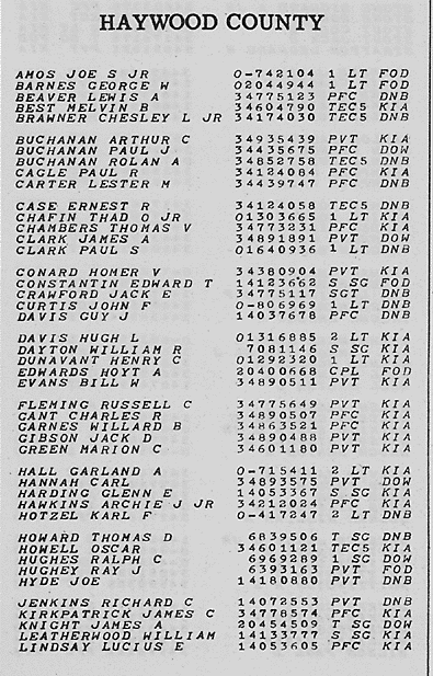 Tabulations for Haywood Co. KIA = 56 DOW = 11 DOI = 00 DNB = 25 FOD = 08 M = 00 Total = 100 |