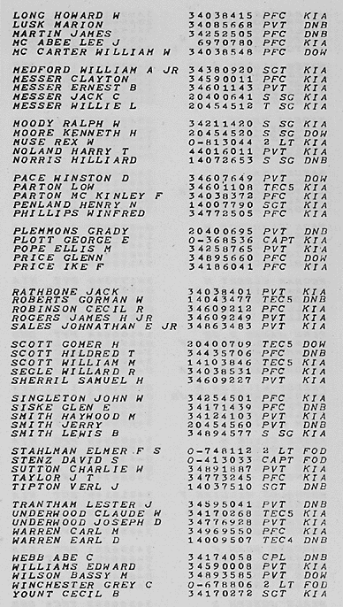 | Howard W. Long Marion Lusk Lee J. McAbee William W. McCarter William A. Medford, Jr. Clayton Messer Ernest B. Messer Jack C. Messer Willie L. Messer Ralph W. Moody Kenneth H. Moore Rex W. Muse Harry T. Noland Williard Norris Winston D. Pace Low Parton McKinley F. Parton Henry N. Penland Winfred Phillips Grady Plemmons George E. Plott Ellis M. Pope Glenn Price Ike F. Price Jack Rathbone Gorman W. Roberts Cecil R. Robinson James H. Rogers, Jr. Johnathan E. Sales, Jr. Gomer H. Scott Hildred T. Scott William M. Scott Willard R. Segle Samuel H. Sherril John W. Singleton Glen E. Siske Haywood M. Smith Jerry Smith Lewis B. Smith Elmer F. S. Stahlman David S. Stenz Charlie W. Sutton J. T. Taylor Verl J. Tipton Lester J. Trantham Claude W. Underwood Joseph D. Underwood Carl M. Warren Earl D. Warren Abe C. Webb Edward Williams Bassy M. Wilson Grey C. Winchester Cecil B. Yount |