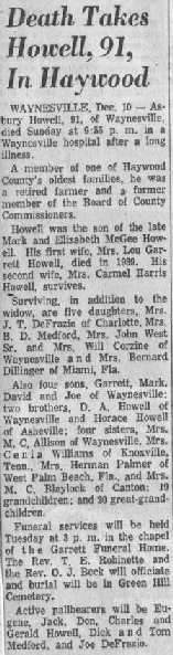 WAYNESVILLE--Dec. 10--Asbury Howell, 91, of Waynesville, died Sunday at 9:55 p.m.in a Waynesville hospital after a long illness. A member of one of Haywood County's oldest families, he was a retired farmer and a member of the Board of County Commissioners. Howell was the son of the late Mark and Elizabeth McGee Howell. His first wife, Mrs. Lou Garrett Howell, died in 1939. His second wife, Mrs. Carmel Harris Howell, survives. Surviving, in addition to the widow, are five daughters, Mrs. J. T. DeFrazio of Charlotte, Mrs. B. D. Medford, Mrs. John West, Sr., and Mrs. Will Corzine of Waynesville, and Mrs. Bernard Dillinger of Miami, Fla. Also, four sons, Garrett, Mark, David, and Joe of Waynesville: two brothers, D. A. Howell of Waynesville and Horace Howell of Asheville: four sisters, Mrs. M. C. Allison of Waynesville, Mrs. Cenia Williams of Knowville, Tenn., Mrs. Herman Palmer of West Palm Beach, Fla., and Mrs. M. C. Blaylock of Canton: 19 grandchildren and 20 great-grandchildren. Funeral services will be held Tuesday at 3 p.m. in the chapel of the Garrett Funeral Home. The Rev. T. E. Robbinette and the Rev. O. J. Beck will officiate and burial will be in Green Hill Cemetery. Active pallbearers will be Eugene, Jack, Don, Charles, and Gerald Howell, Dick and Tom Medford, and Joe DeFrazio. |