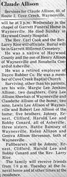 | Claude Allison Services for Claude Allison, 60, of Route 2, Cove Creek, Waynesville, will be held at 2 p.m. Wednesday in the chapel of Garrett Funeral Home in Waynesville. He died Sunday in Haywood County Hospital. The Rev. Carl Cook and the Rev. Larry Rice will officiate. Burial will be in Garrett-Hillcrest Cemetery. He was a native of Haywood County and the son of Henry Allison of Waynesville and Rosabella Conard of Asheville. He was a retired employee of Dayco Rubber Co. He was a member of the Cove Creek Baptist Church. Surviving, other than his parents, are his wife, Margie Lee Jenkins Allison; two daughters, Cora Lee Allison Sheehan of Waynesville and Claudette Allison of the home; two sons, Lewis Lee Allison of Waynesville and Robert Lee Allison of the home; five brothers, Johnny, Ernest, Clifford, Harold Lee and Bobby Conard, all of Asheville; three sisters, Hattie Ramsey of Waynesville, Helen Allison and Geniva Allison Stevenson of Waynesville. Pallbearers will be Johnny, Ernest, Clifford, Harold Lee, and Bobby Conard and the Rev. Larry Rice. The family will receive friends from 7-9 p.m. Tuesday at the funeral home and at other times at the residence |