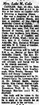 at her home on Candler RFD 3 following a lingering illness. Surviving are the husband, John K. Cole; four sons, Ted, Pat and Howard of Canton, and Otis of Clyde; four brothers, Lote Mason, Lude and S. B. of Candler, and Walter of Forks, Wash.; three sisters, Mrs. H. H. Cathey of West Asheville, Mrs. Eurastus Williams and Mrs. W. B. Young of Candler, and six grandchildren. Funeral services will be held at 2:30 p. m. Sunday at Snow Hill Methodist Church. The Rev. Vaughn Cannon and the Rev. Bryce Wright will officiate, and burial will be in the church cemetery. Active pallbearers will be Rhea Poore, Bob Tate, Buck Scarborough, Ottho Brooks, Herman Williams and Dewey Campbell. Honorary pallbearers will be Dr. Edward Camp, Dr. Lawrence Mucel, Dr. Edward Smith, George Herron, Kim Cathey, Harlan Cathey, Dan Tate, Darrell Wright, Brownlowe Trull, H. L. Setzer, Burrough Harrison and W. E. Sheffield. The body will be taken to the home at 3 p. m. Saturday and will lie in state at the church for 30 minutes prior to the services. |