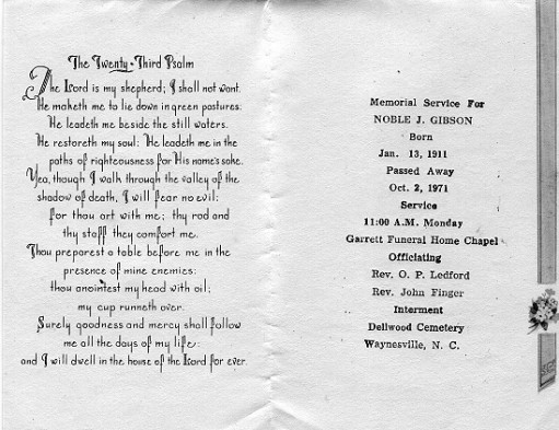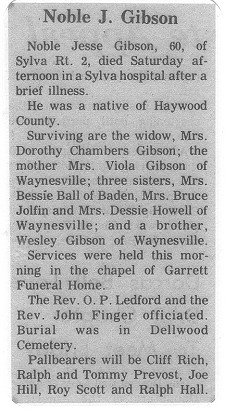 Hospital after a brief illness. He was a native of Haywood County. Surviving are the widow, Mrs. Dorothy Chambers Gibson; the mother, Mrs. Viola Gibson; three sisters, Mrs. Bessie Ball of Baden, Mrs. Bruce Joslin and Mrs. Dessie Howell of Waynesville; and a brother, Mr. Wesley Gibson of Waynesville. Services were held this morning in the chapel of Garrett Funeral Home. The Rev. O. P. Ledford and the Rev. John Finger officiated. Burial was in the Dellwood Cemetery. Pallbearers will be Cliff Rich, Ralph and Tommy Prevost, Joe Hill, Roy Scott, and Ralph Hall. |