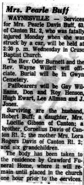 WAYNESVILLE--Services for Mrs. Pearle Davis Buff, 63, of Canton Rt. 2, who was fatally injured Monday when she was struck by a car, will be held at 2:30 p.m. Wednesday in Cruso Baptist Church. The Rev. Oder Burnett and the Rev. Wayne Willett will officiate. Burial will be in the Gwyn Cemetery. Pallbearers will be Gay Williams, Don and Roy Henson, Hugh Ewart, Lee Allman and J. Jones. Surviving are the husband, Robert Buff: a daughter, Mrs. Lucille Gibson of Canton: a brother, Cornelius Davis of Canton Rt. 2: the mother, Mrs. Lora Rogers Davis of Canton Rt. 2: and six grandchildren. The body has been taken to the residence by Crawford Funeral Home, where it will remain until placed in the church one hour prior to the services. |