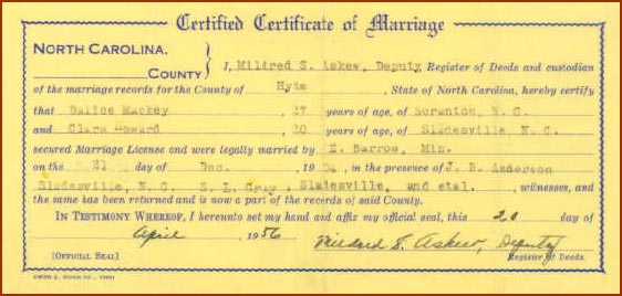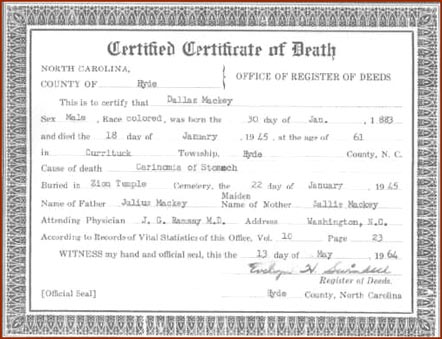 Marriage Certificate for Cloey Howard & Dalice MackeyDallas Mackey had been previously married to Sallie Williams on April 7, 1898. According to a Hyde Co. death certificate, Dallas Mackey was born to Julius Mackey and his wife Sallie on January 30, 1883 and died January 18, 1945 at the age of 61. He is buried in Zion Temple Cemetery. Julius Mackey died in Currituck Twp. on Feb. 25, 1921 and was listed as the son of Rachel Mackey.