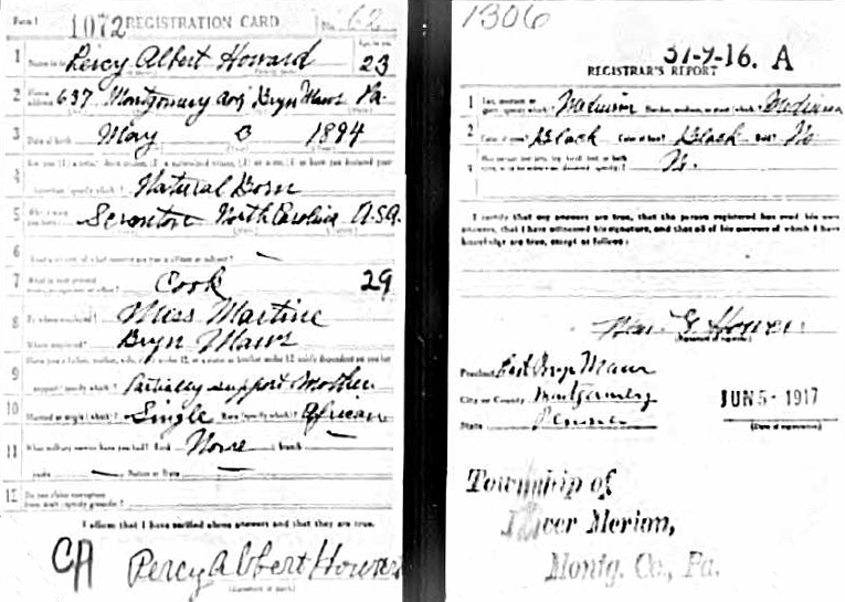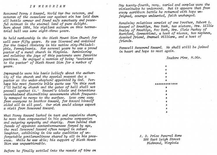 Percy Albert Howard was born in Sladesville and according to the 1900 census was born in May 1891 [WWI Draft Card states May 1894 and the Memorial Card below states "about 1884"]. In 1966 Percy gave an affidavit on his brother's delayed birth certificate and was living at that time in Brooklyn, NY.