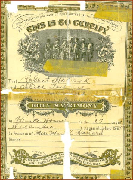 Robert Howard and Alice Fortiscue [were married] at Private Home on the 27 day of December in the year of our Lord 1877 in the Presence of Mrs. Mar___ [Mariah?] Howard.