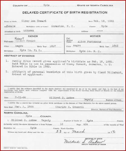 Clint Howard - Although no record of Clint Howard can be found thus far in the census records, we know that he was the father of Robert Howard from Robert's 1925 death certificate filed in Hyde Co. in Bk. 5, pg. 141. Clint Howard was also listed as the father of York Howard who was born, according to the 1900 Hyde Co. census, in July 1858 and died in Hyde Co. in 1937. His death certificate indicated his mother was Celia Howard. From the 1866 cohabitation records of Hyde County we find that Clint Howard and Celia Frances Howard had cohabited for 24 years and were owned by Cornelius Howard. Thus, the assumption is that Robert and York Howard were both sons of Clint and Celia Frances Howard. Celia Frances was found in the 1880 Hyde Co. census (Currituck Twp.) and was living one house away from Cornelius Howard, the man that had formerly owned she and her husband, Clint.