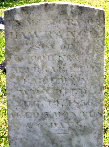 | Bateman, Lawrence | [Mar. 8, 1865] | Aug. 14, 1865 | In Memory Of - Son of John & Margaret E. Bateman - Aged 5 months & 6 days |