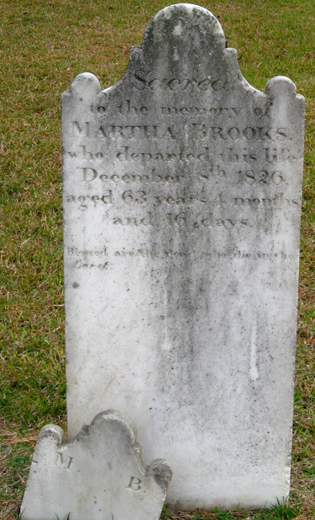 | Brooks, Martha | [July 22, 1763] | December 8th 1826 | Sacred to the memory of - aged 63 years 4 months and 16 days - Blessed are the dead who die in the Lord. |