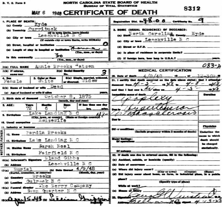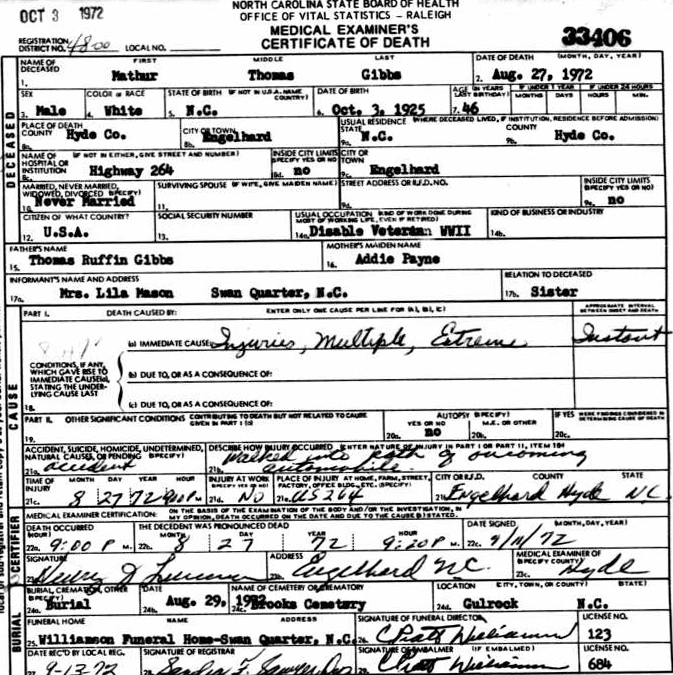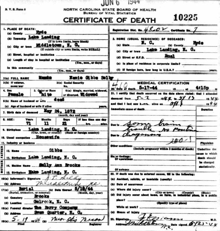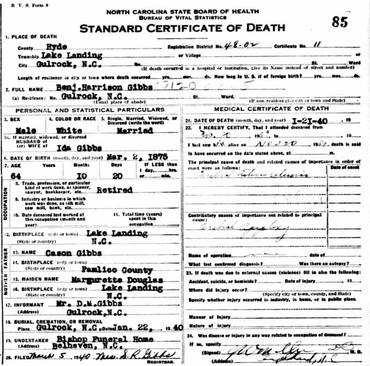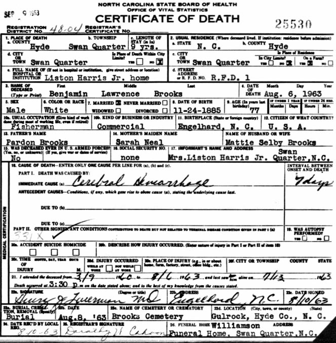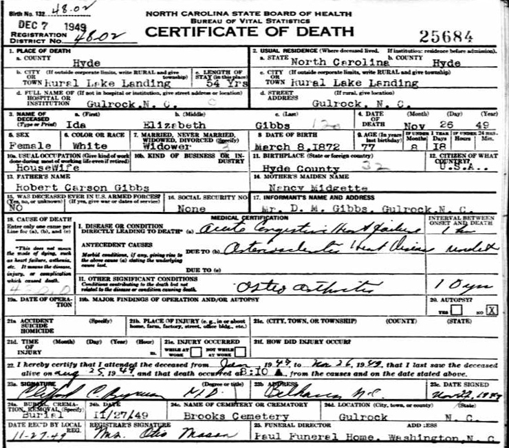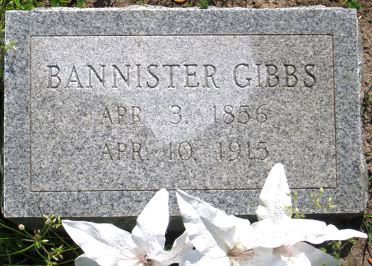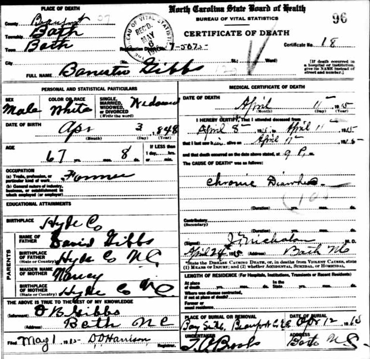 | Gibbs, Bannister | Apr. 3, 1856 | Apr. 10, 1915 | [Death certificate states birth as April 3, 1848 & death as April 11, 1915 in Bath, Beaufort Co., NC. Also states buried at Bayside Cemetery in Beaufort County. Bannister married Sarah Ann Brooks in Hyde Co. on Jan. 12, 1871 and they lived in Hyde from 1880-1910. His birth in the 1900 census is given as April 1848.] |