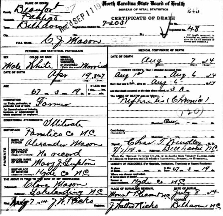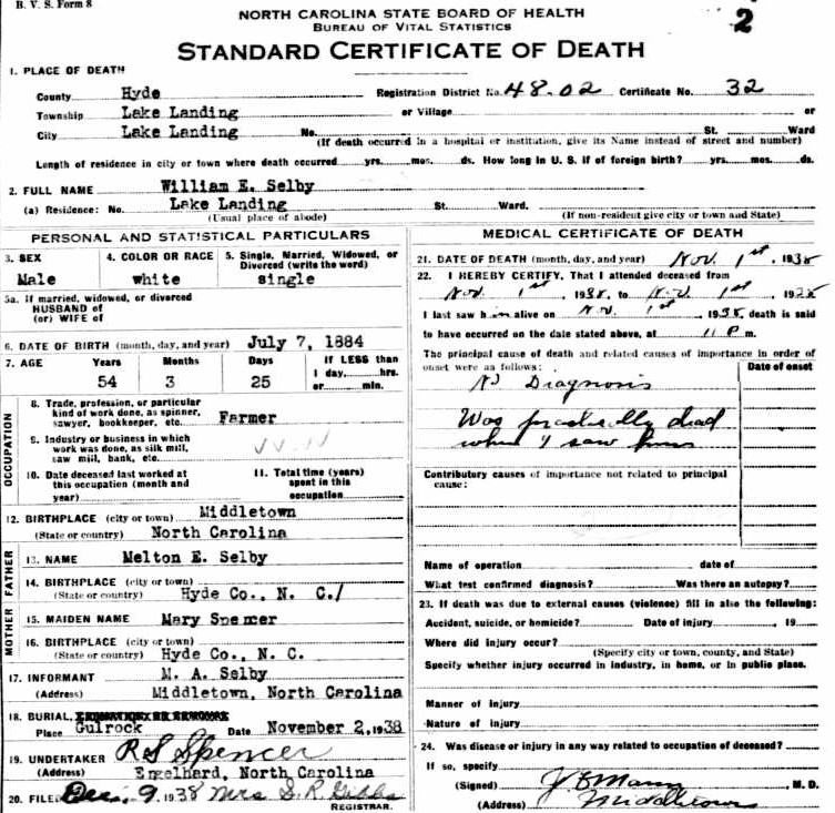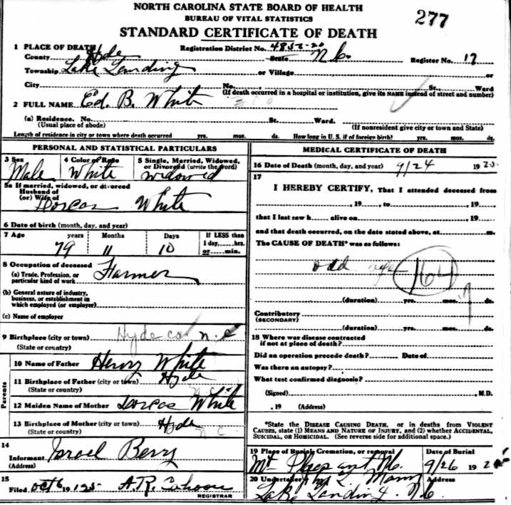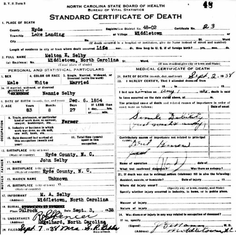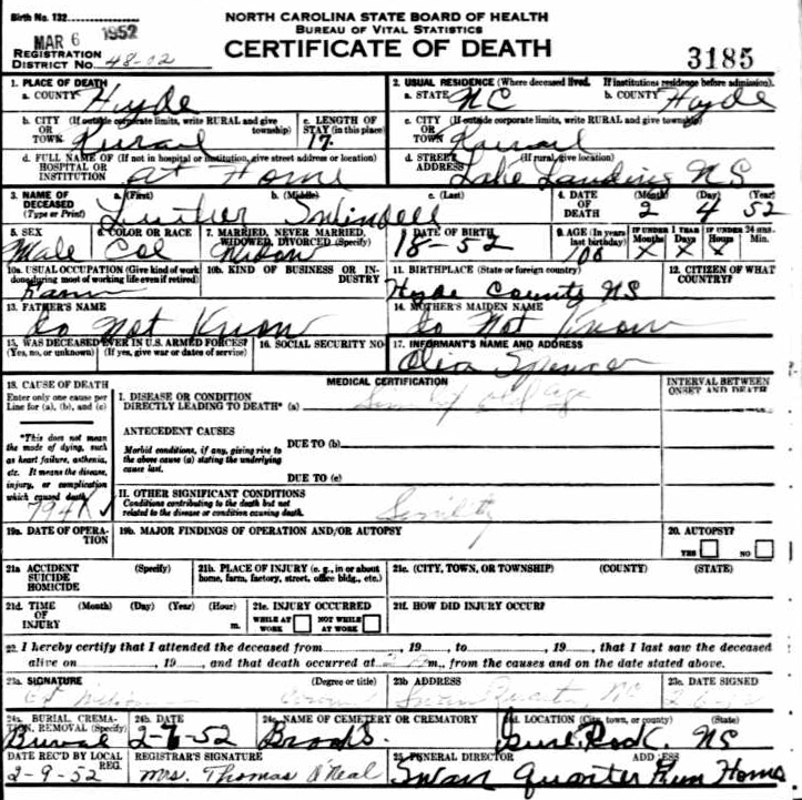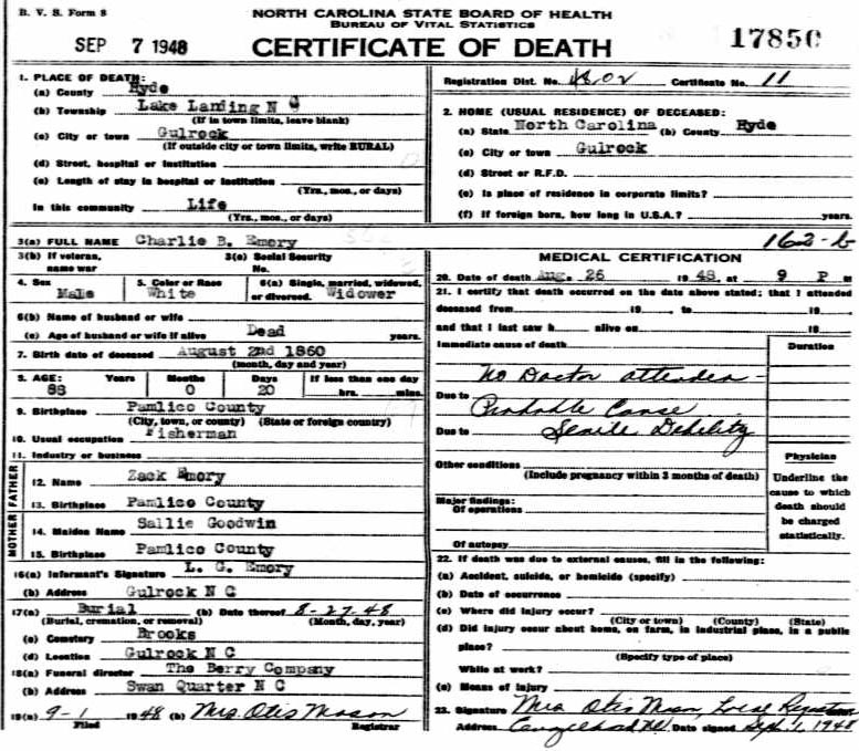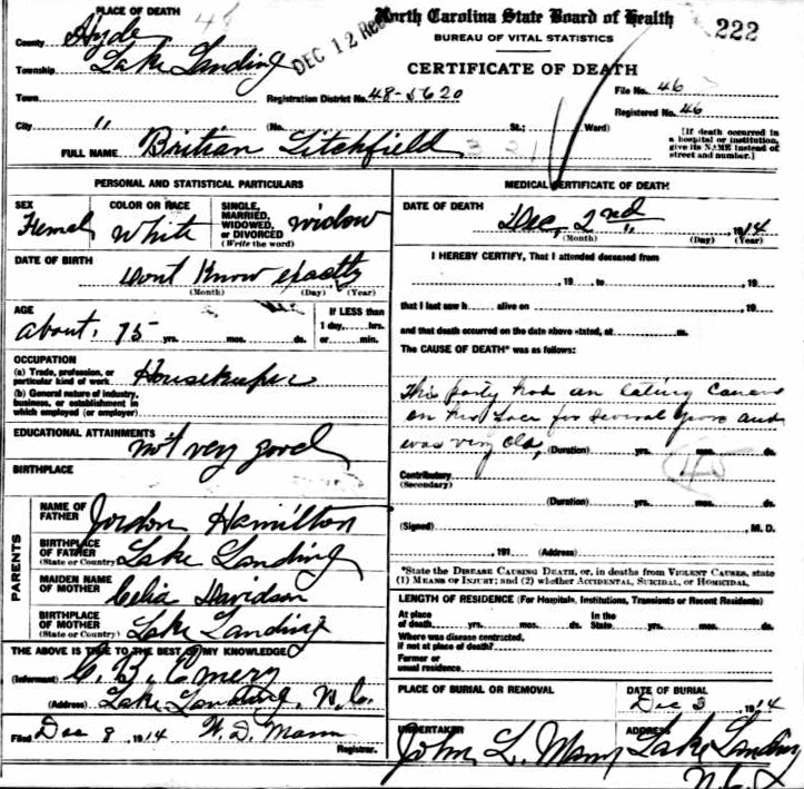 | Gibbs, Bannister | Apr. 3, 1856 | Apr. 10, 1915 | [Death certificate states birth as April 3, 1848 & death as April 11, 1915 in Bath, Beaufort Co., NC. Also states buried at Bayside Cemetery in Beaufort County. Bannister married Sarah Ann Brooks in Hyde Co. on Jan. 12, 1871 and they lived in Hyde from 1880-1910. His birth in the 1900 census is given as April 1848.] |