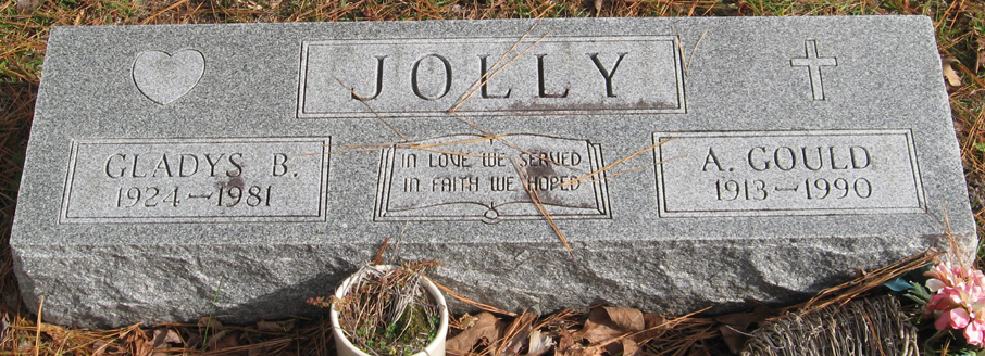 | Jolly, Gladys B. | 1924 | 1981 | In love we served, in faith we hoped. [Double with A. Gould Jolly] |