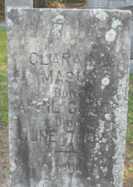 | Mason, Clara J. [Clarissa Jane] | April 6, 1859 | June 7, 1926 | Gone, but not forgotten. |