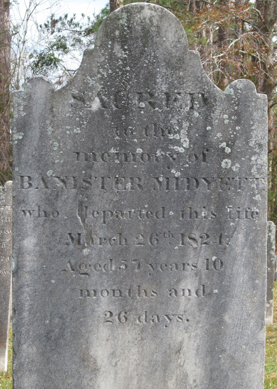 | Midyett, Banister | [May 1, 1766] | March 26th 1824 | Sacred to the memory of - Aged 57 years 10 months and 26 days. |