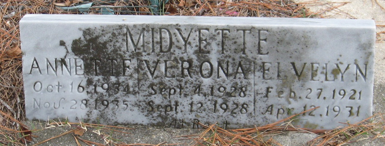 | Midyette, Elvelyn | Feb. 27, 1921 | Apr. 12, 1931 | At Rest [Triple with Annette & Verona Midyette] |
