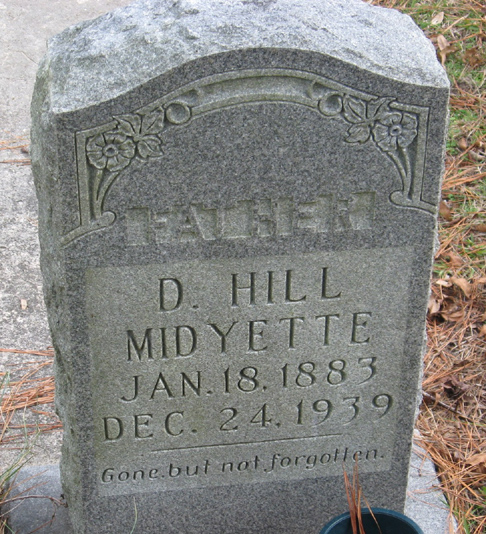 | Midyette, D. [Daniel] Hill | Jan. 18, 1883 | Dec. 24, 1939 | Father - Gone but not forgotten. |