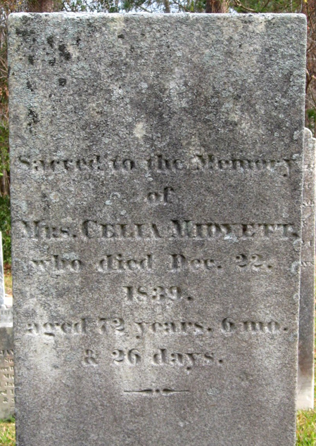 | Midyett, Mrs. Celia | [May 26, 1767] | Dec. 22, 1839 | Sacred to the Memory of - aged 72 years, 6 mo. & 26 days. |