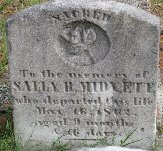 | Midyett, Sally B. | [July 30, 1861] | May 16, 1862 | Sacred To the memory of - aged 9 months & 16 days. |