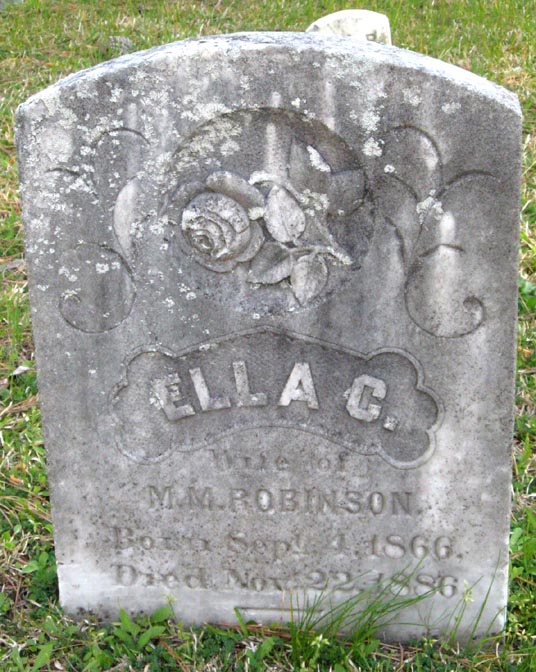| Robinson, Ella C. | Sept. 4, 1866 | Nov. 22, 1886 | Wife of M.M. Robinson |