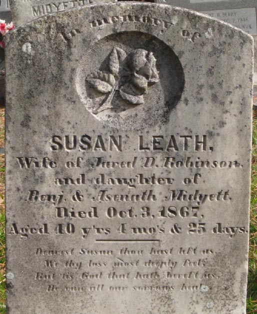 of Jared D. Robinson and daughter of Benj. & Asenath Midyett. Aged 40 y'rs 4 mo's & 25 days.