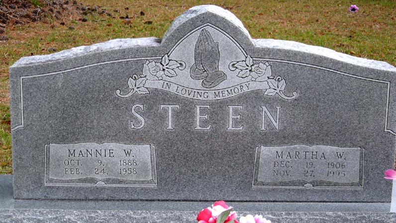 | Steen, Martha W. | Dec. 19, 1906 | Nov. 27, 1995 | In Loving Memory [Double with Mannie W. Steen] |