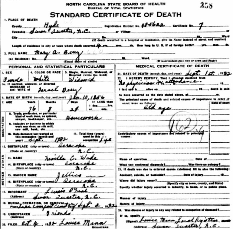 | Berry, Mary Ann | [Jan. 10, 1856] | [Sept. 1, 1932] | [no headstone found] [death certificate states buried in Lake Comfort Cemetery] |