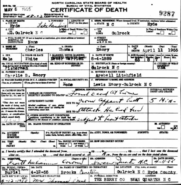 | Emory, Charles Thomas | [Aug. 4, 1889] | [Apr. 11, 1955] | [grave covered with cement] [see death certificate] |