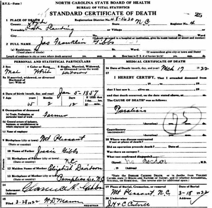 | Gibbs, James Franklin | [Jan. 5, 1857] | [Mar. 17, 1922] | [no headstone found] [see death certificate] |