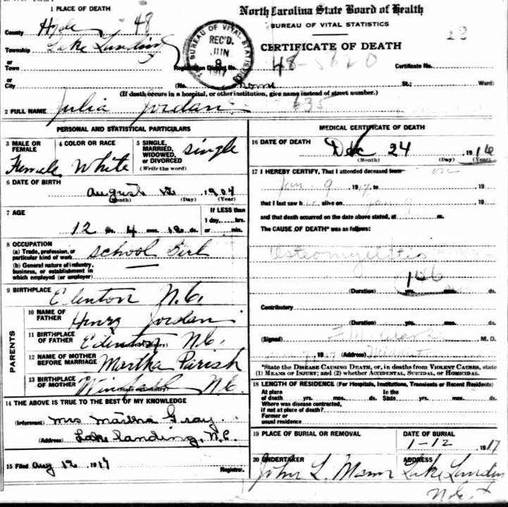 | Jordan, Julia | [Aug. 12, 1904] | [Dec. 24, 1916] | [no headstone found; no place of burial given on death certificate] |