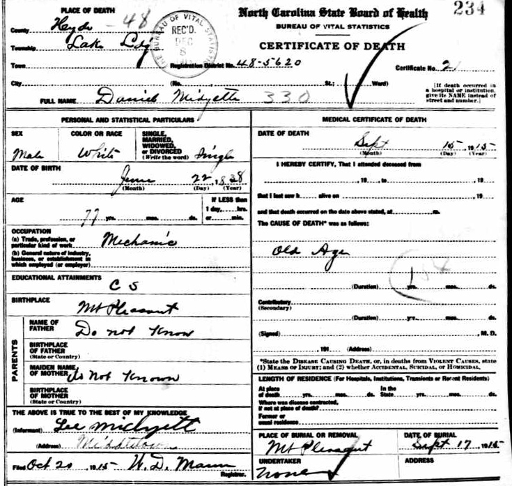| Midyette, Daniel Jr. | [June 22, 1838] | [Sept. 15, 1915] | [no headstone found] [see death certificate] |