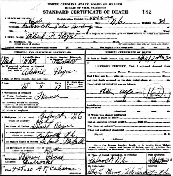 | Payne, Millard F. [Filmore] | [Jan. 10] 1851 | [Apr. 27] 1930 | Father [Double with Adeline B. Payne] [see death certificate] |