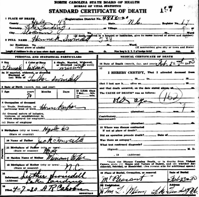| Swindell, Hannah [black] | [Jan. 17, 1862] | [Feb. 22, 1930] | [no headstone found but death certificate states buried at Mt. Pleasant] |