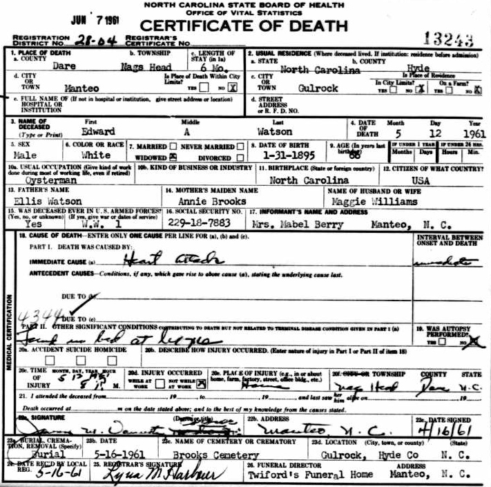 | Watson, Edward A. | [Jan. 31, 1895] | [May 12, 1961] | [death certificate states buried in Brooks Cemetery in Gulrock] |