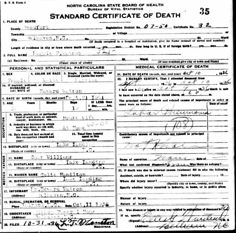 | Watson, Margaret Francis | [Sept. 21, 1901] | [Oct. 10, 1936] | [no headstone found but death certificate states buried at Gulrock, NC] |