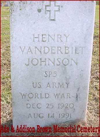 | Johnson, Henry Vanderbilt | Dec. 25, 1920 | Aug. 14, 1991 | SP5 US Army World War II [see obituary] |