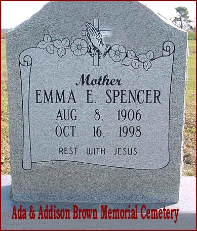 | Spencer, Emma E. [Estelle] | Aug. 8, 1906 | Oct. 16, 1998 | Rest with Jesus; Mother [see obituary] |