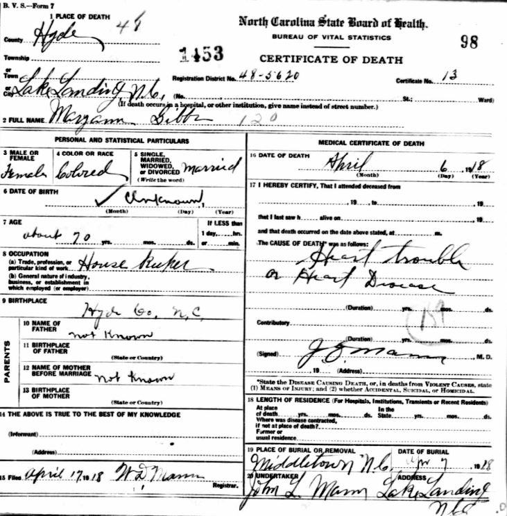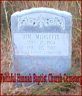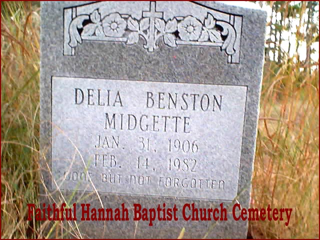 Faithful Hannah Church, also known as Mount Sinai Missionary Baptist Church, was formed in the early nineteenth century under the Rev. George Barrow and served an African-American congregation. A good portion of death certificates list this cemetery as "Middletown Cemetery". I visited this large black cemetery in late October 2001 and tried to take as many photographs of the headstones as possible. Night time caught me so my photography session had to end. Making the pictures was made more difficult by the marshy ground on which the stones stood and also by the cold weather and wind that day. Some of the stones had sunk into the ground almost to the tops which did not allow me to even read a name, much less the birth and death dates. The list below was partially taken from an unpublished booklet by Marjorie T. Selby, Marilyn Green and the History Class of Mattamuskeet High School in 1975. Maldine Whitaker Wallace and her niece, Beverly Merrick, visited this cemetery in late May 2014 but marshy ground, yellow flies and overgrowth of weeds and trees made getting clear pictures almost impossible. Some of the headstone photos were snipped from a movie that Maldine took while she was there. Many of the graves listed below can no longer be found in this cemetery. If anyone can add to this list with pictures or corrections please e-mailKay Midgett Sheppard for inclusion.