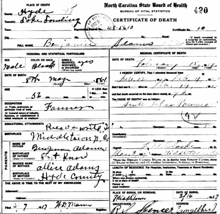 | Adams, Benjamin | May 8, 1861 | Feb. 15, 1917 | [see death certificate] |