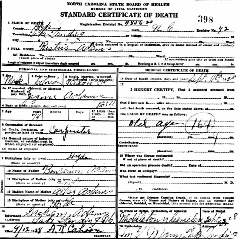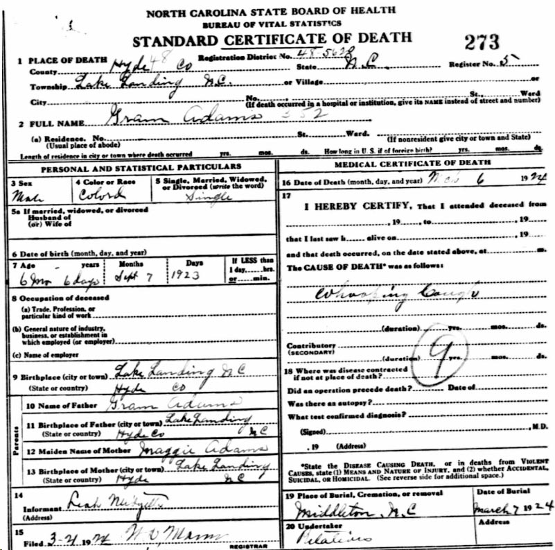 | Adams, Gram | Sept. 7, 1923 | March 6, 1924 | [see death certificate] |