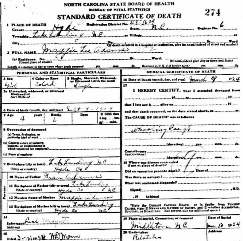 | Adams, Maggie Lee | Sept. 9, 1919 | March 9, 1924 | [see death certificate] |