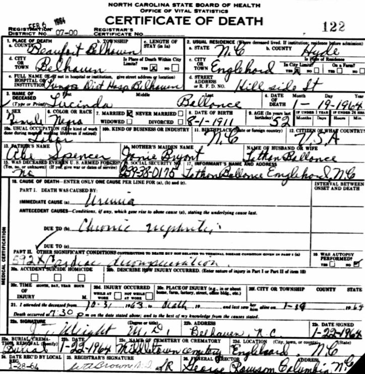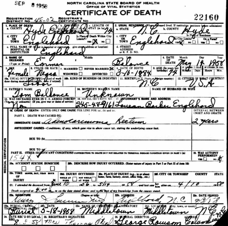 | Ballance, Lucinda | Aug. 1, 1911 | Jan. 19, 1964 | [see death certificate] |