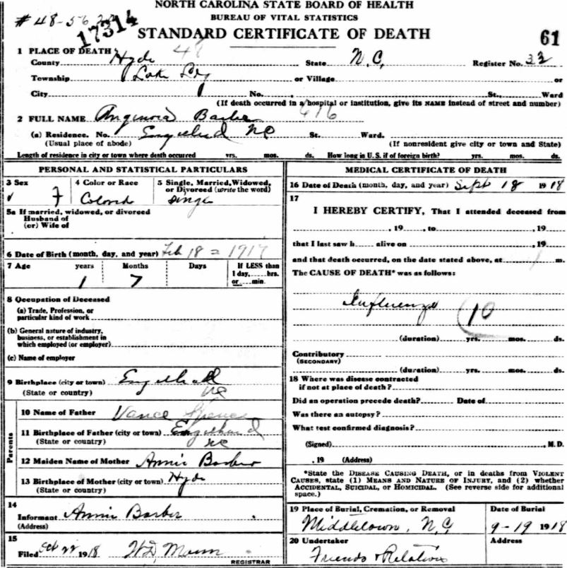 | Barber, Angenora | Feb. 18, 1917 | Sept. 18, 1918 | [see death certificate] |