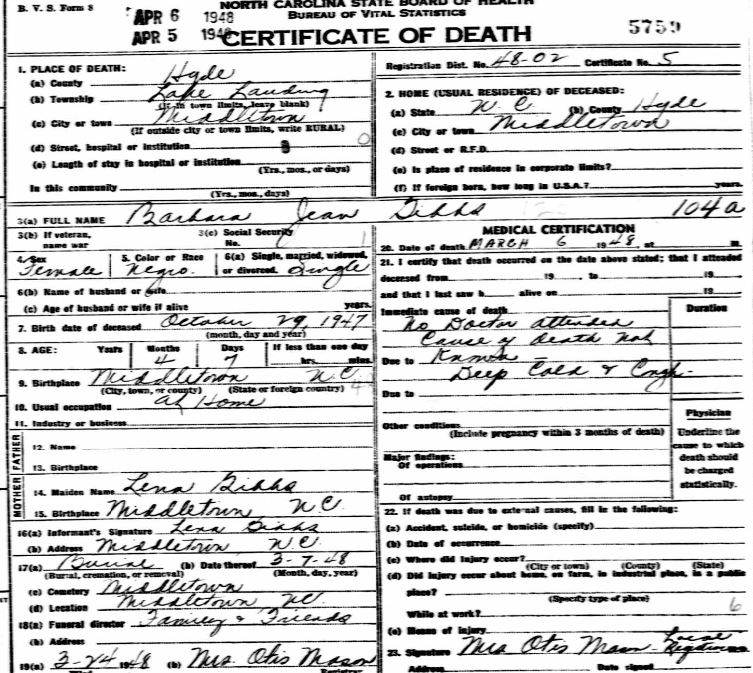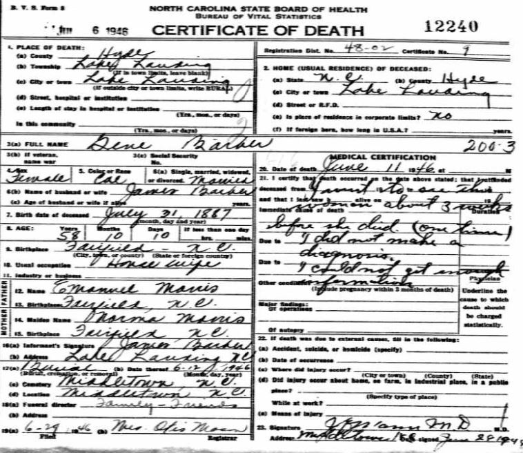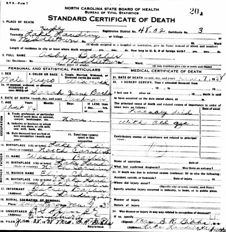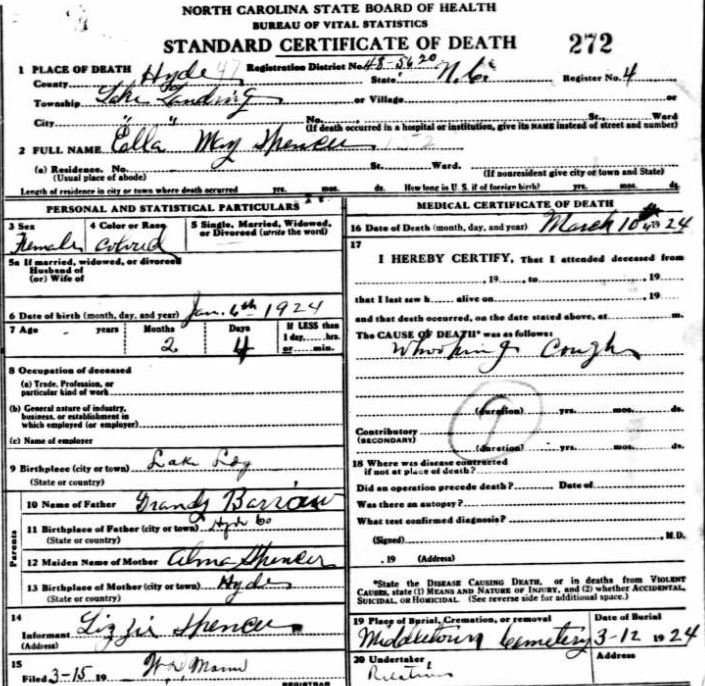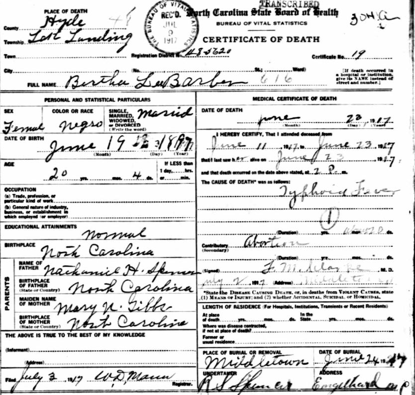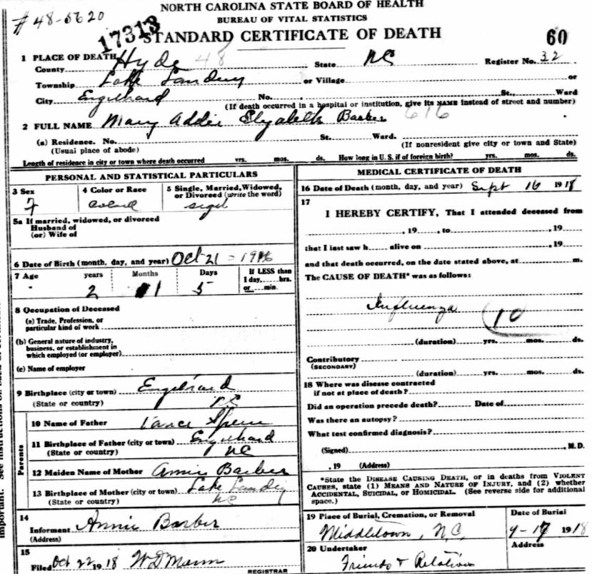 | Barber, Mary Addie Elizabeth | Oct. 21, 1916 | Sept. 16, 1918 | [see death certificate] |