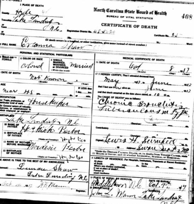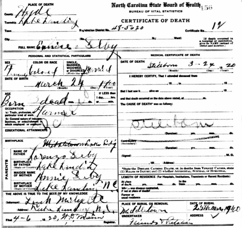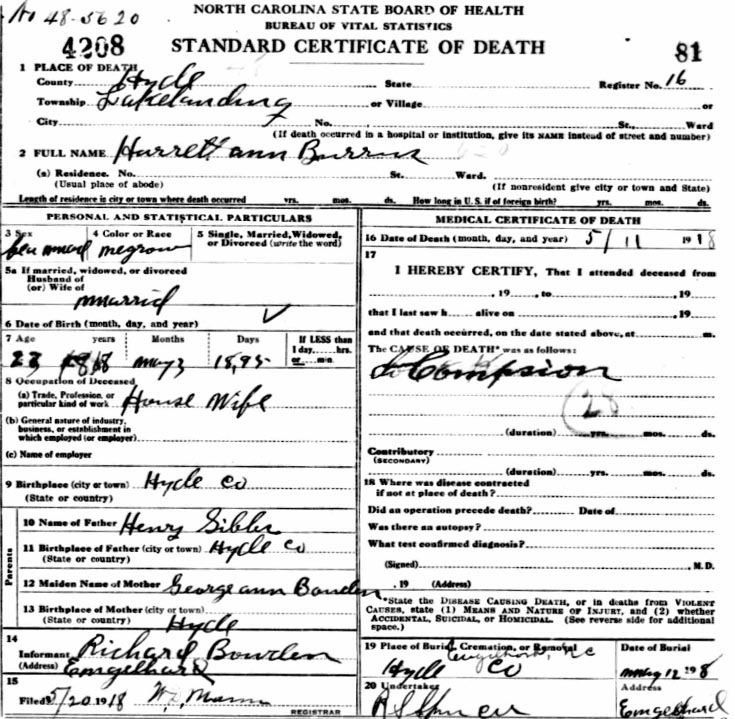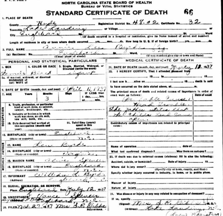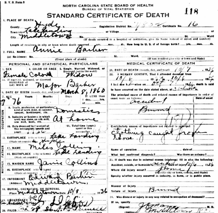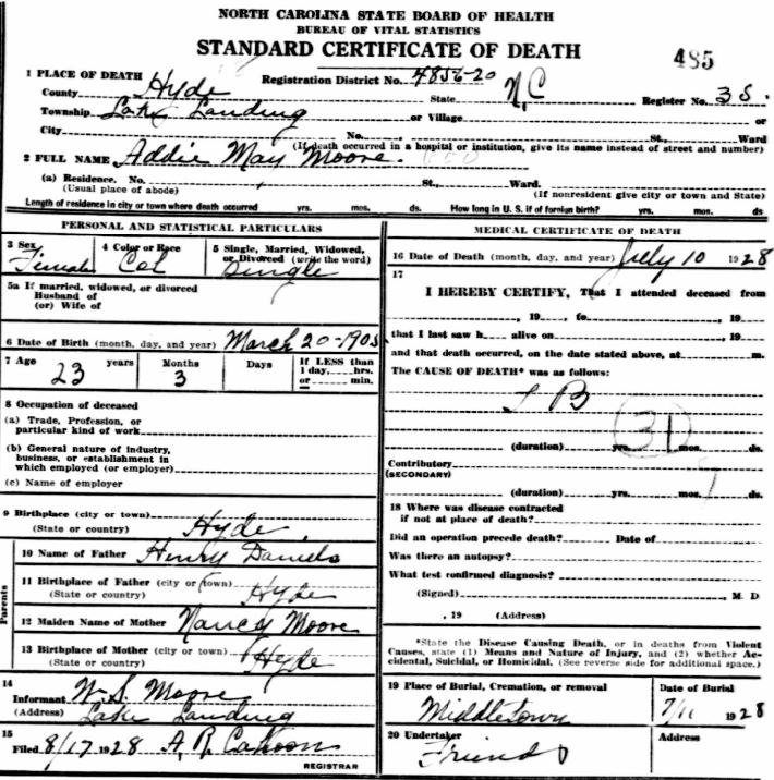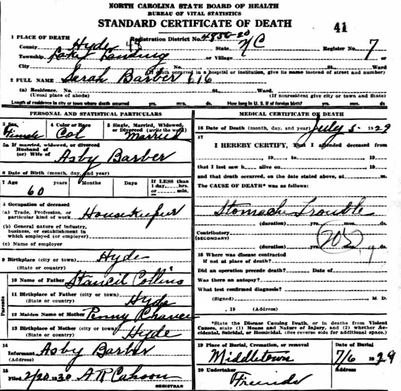 | Barber, Mary Addie Elizabeth | Oct. 21, 1916 | Sept. 16, 1918 | [see death certificate] |