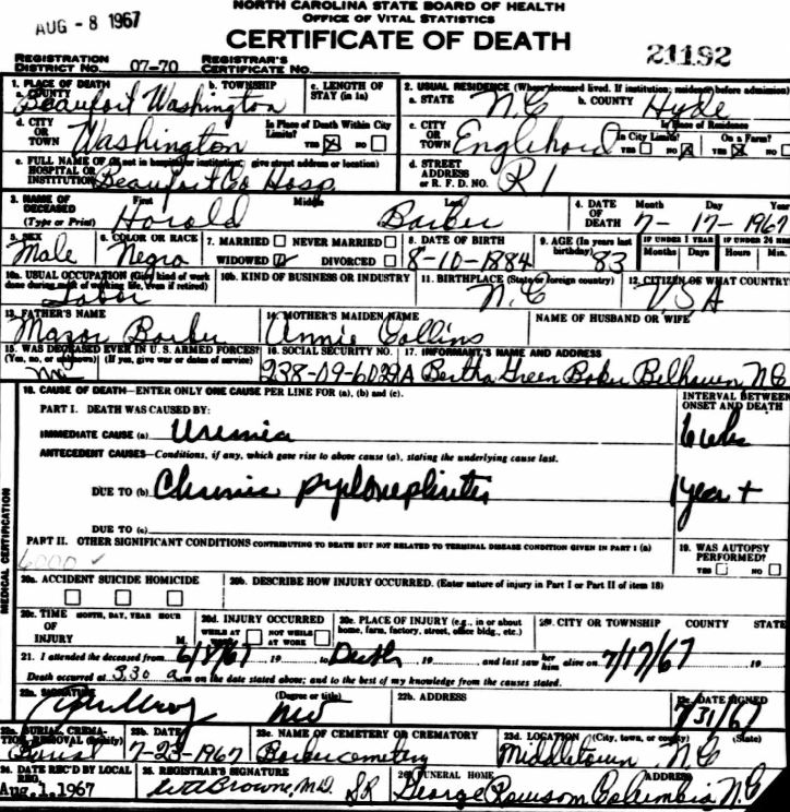 | Barber, Harold | Aug. 10, 1884 | July 17, 1967 | [seedeath certificate] |