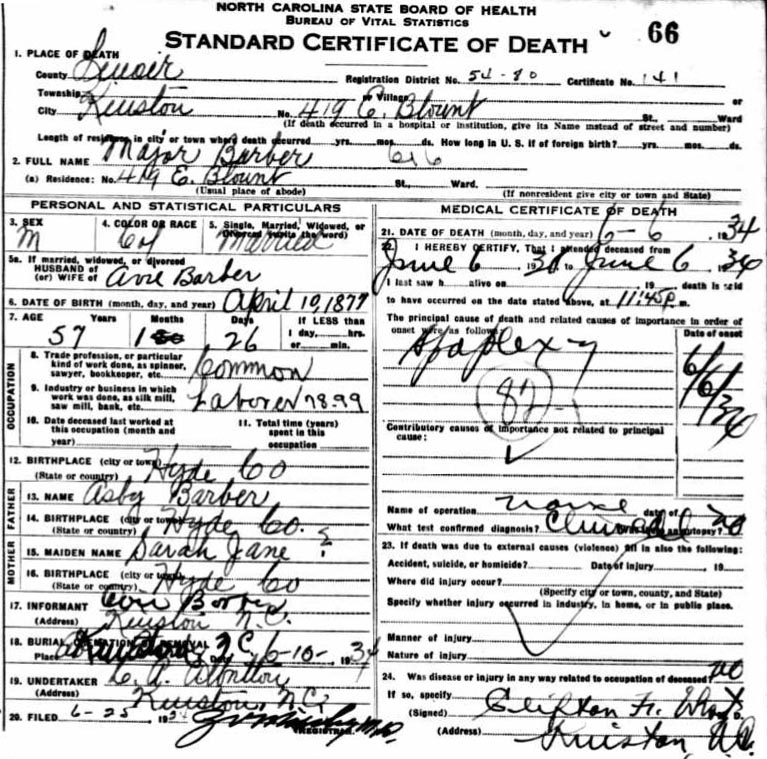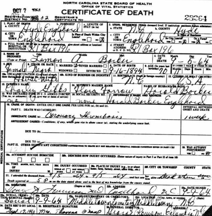 | Barber, Lemon A. | Sept. 16, 1894 | Sept. 5, 1964 | [see death certificate] |